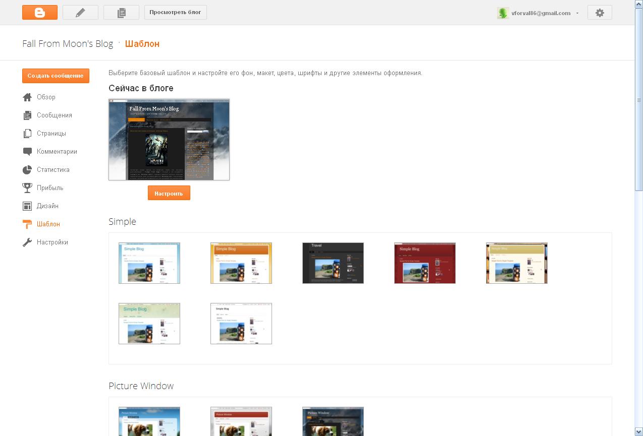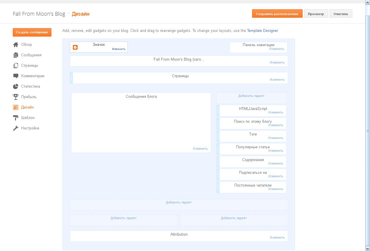 6. Идя дальше по разделам, нельзя не упомянуть одно из по-моему самых неудачных решений. То, что по логике должно было бы стать одним разделом стало аж тремя. Речь о "Страницах", "Дизайне" и "Шаблоне". Так в "Дизайне" вы настраиваете расположение элементов на странице и сами элементы, а в "Шаблонах" помимо выбора этих самых шаблонов тоже настраиваете разные элементы блога. Ну а второстепенные "Страницы" в качестве отдельного раздела - решение вообще спорное.