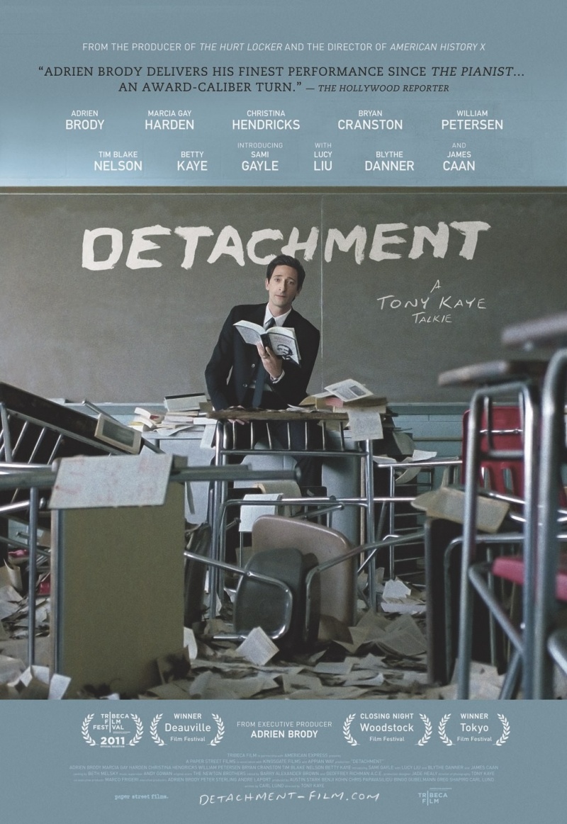Посмотрел новый фильм от автора "Американской истории Икс" Тони Кэя - "Detachment". Наши лохализаторы, видимо глянув синопсис, перевели название как "Учитель на замену". И тут, в общем-то, не поспоришь. Действительно, главный герой работает учителем на замену. Но, это фильм про школу в той же мере, что "Американская история Икс" фильм про скинов. То есть на самом деле кино немножко сложнее и называется оно поэтому "Отчужденность" или "Отстраненность".