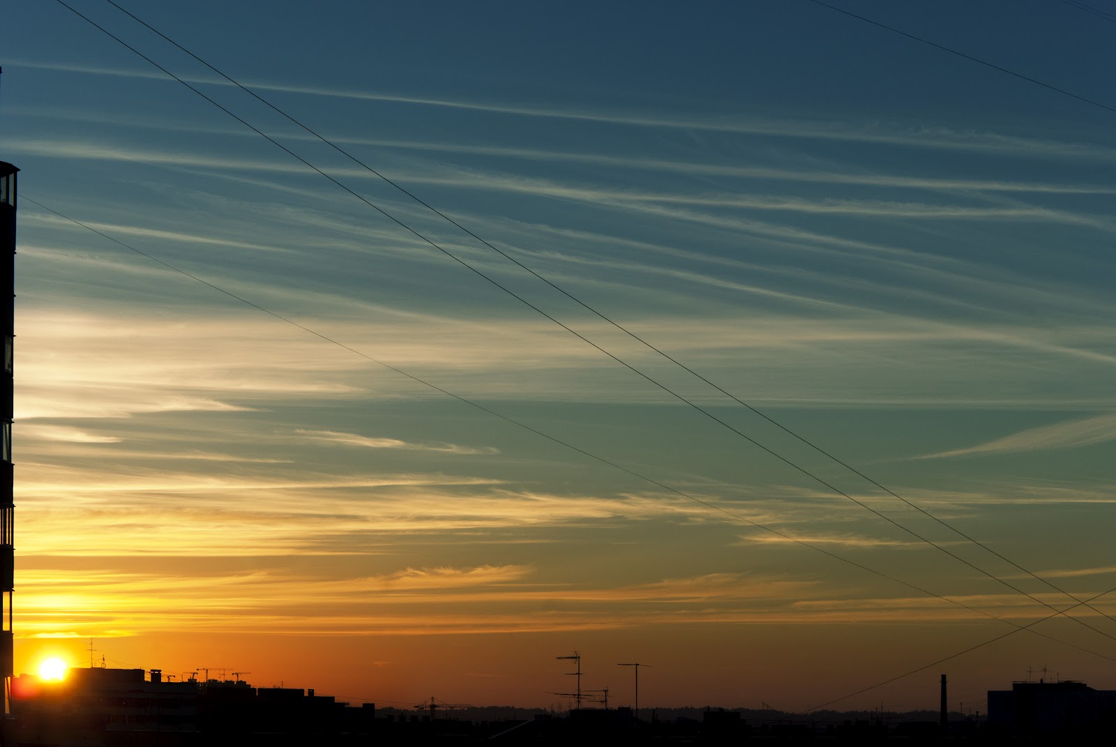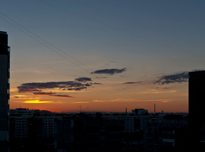 Во время бессонницы, с удивлением для себя, обнаружил, что в это время года солнце встает не на востоке, а на северо-востоке. А садится, соответственно, на северо-западе. Так что я все это дело могу наблюдать прямо из окна. А еще я тут взял у друзей зеркалку побаловаться. В общем вот вам пара фоток. Сразу предупреждаю, я первый раз в жизни снимал и обрабатывал в raw, да и зеркалками я не особо много пользовался. Осторожно, внутри фотожоп:)